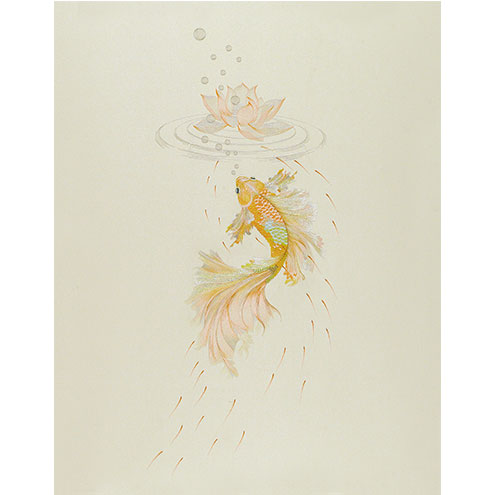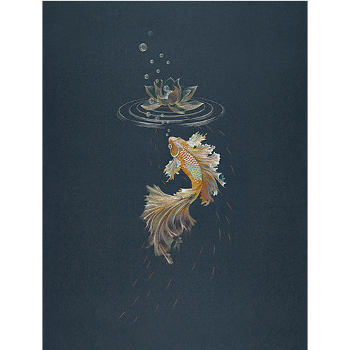 清清浅浅一池水,露珠滚动,莲花姿态怡然,瓣瓣分明,在水中摇摆,素雅动人。尾展拖轻縠,妆新炫绛霓,金鱼正摇摆着尾巴,似乎正向着前方的莲花游去,恰似美人轻舞。落花有情,游鱼有意,鱼儿潜游,在落花间嬉戏。游鱼戏落花,既情调,亦是诗意。落花与游鱼的相遇抒发一份宁静舒服的心境。