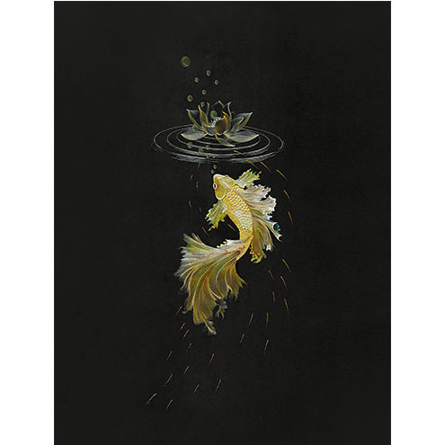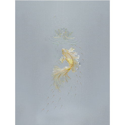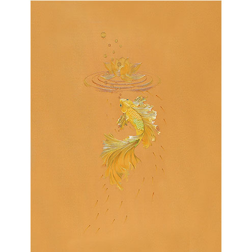 莲花金鱼二者结合,寓意美好。荷花有高洁、清白的品质。金鱼谐音金玉,又金又玉,再者鱼也带有年年有余、富贵有余这样的寓意。金鱼积蓄力量准备腾飞而起,有对未来的美好祝福。适用于玄关等。